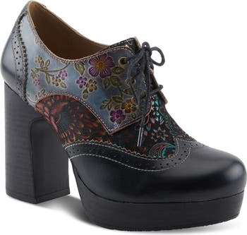 Brogue perforations and baroque-inspired floral embossing add stunning dimension to a leather wingtip derby lofted by a chunky platform and soaring block heel.