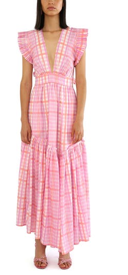 Plaid ruffles steal the spotlight on this dreamy maxi dress, adding playful texture and movement to the softly tiered silhouette.