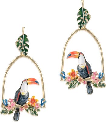 Swing into Paradise with these Enchanting Toucan & Bloom Statement Earrings. Escape to a tropical haven with these captivating statement earrings, a vibrant celebration of nature's artistry brought to life by Bill Skinner Studio. Each earring showcases a beautifully detailed toucan perched within a delicate, gold-toned hoop, creating a captivating frame for this exotic bird. The toucan's striking plumage, with its vibrant beak and intricate markings, is perfectly complemented by the enamel flowers and leaves that surround it, creating a miniature tropical scene you can wear. These earrings aren't just accessories; they're a wearable escape, a reminder of sun-drenched shores and the vibrant spirit of the rainforest. The playful movement of the toucan within the hoop adds an extra touch of whimsy, making these earrings a true conversation starter. Whether you're dreaming of island getaways or simply adding a touch of exotic flair to your everyday look, these toucan earrings will transport you to a world of wonder. Embrace the call of the wild and add a touch of tropical magic to your summer jewellery collection.