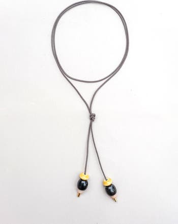 The TOUCAN necklace is playful, earthy, and effortlessly chic. Designed with a sleek adjustable cord and finished with double drop-bead accents in glossy black, soft neutrals, and sunlit yellow, it brings a fresh, modern twist to the classic lariat silhouette. Lightweight and easy to style, it adds a subtle pop of color and movement to any lookp erfect for dressing up a simple tee or layering with your everyday favorites.