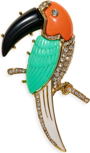 Personalize your formal attire with a tropical flourish from this toucan pin shimmering with crystal adornments and vibrant coloring.