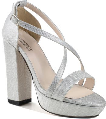 Crisscrossing vamp straps create visual intrigue on a statement-making sandal lifted by a chunky platform and soaring block heel.
