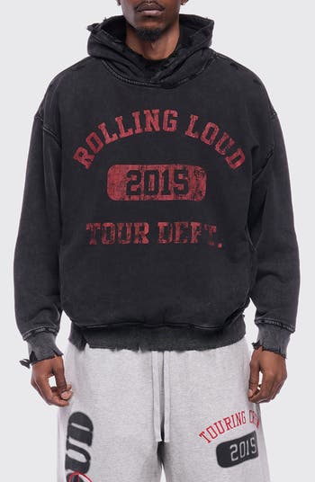 A faded graphic gives lived-in appeal to this distressed cotton hoodie rendered in a comfortable relaxed fit.