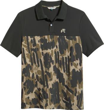 Camouflage color blocking commands attention on this cotton polo topped with a classic spread collar.