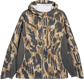 This camouflage rain jacket makes a statement on or off the course with contrast panels and piping that define its modern construction. Designed in a relaxed fit with a waterproof finish, it features clean finish seams, side zip pockets and a graphic logo at the chest for a functional layer built to last.