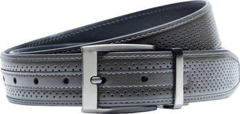 Full-length perforations pair with a smooth, solid finish to double your wearing options in a reversible leather belt that lets you go casual or elevated depending on your look. The squared pin buckle adds a burnished shine to cinch the easy, everyday versatility.