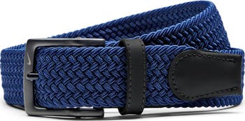 Woven from stretchy elastic cording, this sporty, all-activity belt features leather accents and dark hardware that buckles anywhere to secure a perfect fit.