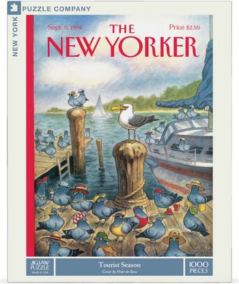 Tourist season is here! This challenging 1000 piece puzzle pokes fun at the annual exodus of residents from the city to seaside vacation spots. With his witty illustration style, Peter de Sève captures the satirical essence of busy tourist, represented by a flock of pigeons seeking relaxation on a calm summer dock and a not-so-amused local seagull.