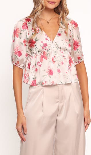 Watercolor flowers bloom across this smooth satin babydoll top framed by pretty puff sleeves and a fluttery peplum.