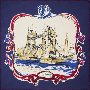 A scarf made in Italy from cashmere silk twill. The style is printed with hand-painted artwork depicting London’s Tower Bridge within a border of Union Jack flags, the Burberry logo and the horse from our Equestrian Knight Design.||Square|Hand-rolled edges|Printed Burberry lettering