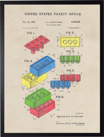 This vintage-inspired print, framed in a black wooden frame, features a toy building brick patent. Sized at 16 inches by 20 inches, this made in the USA frame makes for a beautiful addition to any wall.