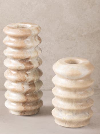 The Tracey Candle Holders blend the elegance of onyx stone with timeless design, creating a set that enriches interiors with sculptural beauty. Hand-carved and polished, each holder reveals natural variations of beige tones enhanced by subtle grey undertones, ensuring individuality and depth in every piece. The ribbed cylindrical form reflects refinement, while the luminous quality of onyx introduces warmth and sophistication. Solid in weight yet graceful in silhouette, Tracey elevates the simple ritual of candlelight into a moment of artistry and luxury. Versatile in style, the Tracey Candle Holders suit dining tables, mantels, or consoles, where their natural stone presence enhances ambiance with quiet grandeur. The soft palette complements both contemporary and traditional settings, while the hand-carved detailing underscores the craftsmanship behind each piece. Whether styled as a pair or mixed with other décor, they provide height, texture, and a sense of permanence. More than functional accents, Tracey embodies the refinement of onyx, turning light and stone into a timeless statement.