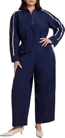 Ace your off-duty look with this striped track jumpsuit, accented with subtle varsity-inspired details. A zip front, elastic waist, and tailored lines create confident, modern energy.