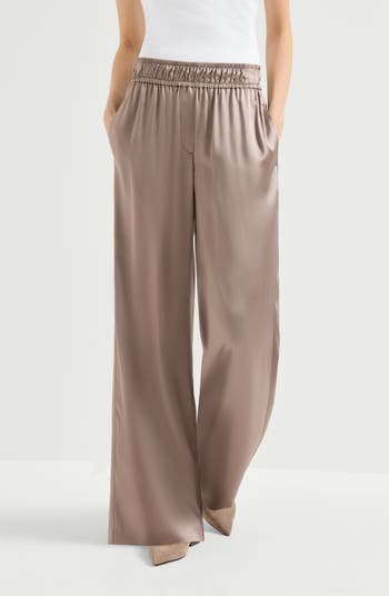 Stretch silk satin, an elegant fabric with a shiny effect and flowing hand, represents a classic of Brunello Cucinelli fine materials. A small amount of synthetic fiber adds to wearer comfort.