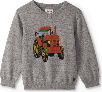 Baby will be off to play (not work) comfortably in this all-cotton sweater centered with an intarsia tractor.