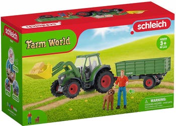 - FARM WORLD: Tractor with Trailer is part of the Farm World collection of figurines and playsets from Schleich. Great for gifting, this playset can stand alone or fit into a larger, modular play world.