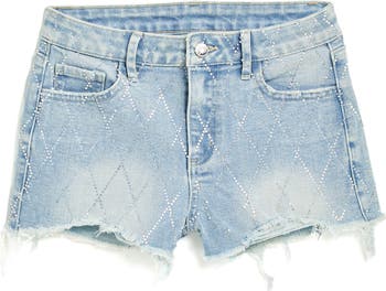 Allover sparkles and distressed hems lend rock-star energy to these stretchy denim shorts made for your junior trendsetter.