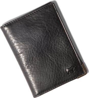 Signature logo accents highlight the full-grain leather of a compact bifold wallet fitted with ample slots for securing your cards and cash.