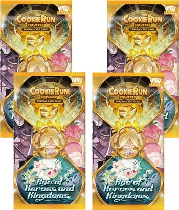 COOKIERUN TCG: AGE OF HEROES & KINGDOMS BOOSTER - 4 PACKS - INCLUDES 4 BOOSTER PACKS: Get into the action quickly by adding 4 booster packs to your Cookie Run game! Card packs are randomly selected and assorted. 9 random cards per pack! AGE OF HEROES & KINGDOMS: Through the synergy created by the five Ancient Cookies with immense power and the mysterious Soul Jams, you can enjoy not only deep strategic choices but also visually stunning deck compositions, enhanced by beautiful illustrations. The moment you play a card, you’ll feel the vivid atmosphere of the battlefield come to life. OPERATION TIMEGUARD: Legendary-tier Cookies have gathered in one place! This grand deck, formed alongside the mystical crystal of nature—the Soul Jam—brings card battles where Legendary Cookies, infused with ancient power, dominate the battlefield! NEW MECHANICS: Each of the five colors have additional mechanics that tweak and deepen their specific gameplay styles. EQUIP CARDS have arrived to unlock brilliant synergy with Cookie Cards! equip the 10 items to your cookies to bring out their maximum power. HISTORY & LEGEND of the Kingdom unite in one pack! With the Five Ancient Cookies, a strategy of victory beyond dimensions begins. INCLUDES: 4 Booster Packs (9 cards each). Note cards are randomly assorted selections. Style, character or cards not guaranteed.