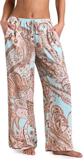 A traditional paisley design colors roomy, wide-leg pants perfect for poolside lounging or grabbing post-beach drinks.