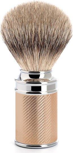 The iconic MÜHLE Traditional Range is a minor marvel of precision, ergonomics and beauty; where classic design meets radiant quality. An opulent twist on a timeless classic, a rose gold chrome finish adds a touch of luxury to the traditional MÜHLE shaving brush. Long lasting and corrosion-resistant, the MÜHLE 09M89RG chrome-plated finish still provides incomparable quality and longevity. Silvertip BadgerNatural, soft and flexible; only the best, carefully selected badger hair is used to create these handcrafted shaving brushes. Silvertip badger hair represents the finest, softest and rarest quality of badger hair available. The hair is renowned for its ability to retain large amounts of water, enabling the brush to quickly produce a dense, stable and creamy lather. Manufactured using historical tools, the semi-circular shape of the brush is created by hand when binding. The fine tips of the hair, therefore, do not require trimming and the natural softness of the hair is retained. This artisan procedure is mastered by only a few specialists worldwide, the quality of work evident in the even black band running through the predominantly silver brush head. Replacement brush heads are available from MÜHLE here. MeasurementsRing size M: 21 mm Dimensions: 31 mm x 100 mm Weight: 130 g