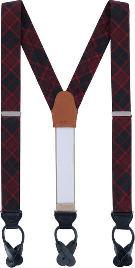Fine silk and leather elevate charming suspenders patterned in timeless plaid.