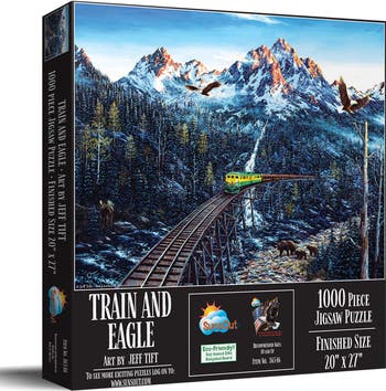 Step into the captivating world of artist Jeff Tift with the Train and Eagle - a 1000-piece jigsaw puzzle that illuminates the enchanting beauty of nature. Expertly depicting vibrant mountains, a majestic train, and an awe-inspiring eagle, this puzzle, measuring a finished size of 20" x 27", is an artistic masterpiece begging to be added to your collection. Showcasing SunsOut Puzzles' superior craftsmanship, the puzzle is durability personified, featuring interlocking pieces carved from high-quality recycled cardboard that fit perfectly together, reducing frustration and enhancing your puzzle-solving experience. An added perk is our commitment to sustainability – our puzzles are proudly USA-made, utilizing eco-friendly soy-based inks and recycled materials, making them an entirely guilt-free choice. SunsOut extends its commitment to excellence even further by offering a comprehensive worry-free guarantee, making your puzzle experience as seamless and enjoyable as possible. The Train and Eagle puzzle transcends the purpose of a mere pastime and serves as a thoughtful gift presented in a large, full-color display box, ideal for any occasion from birthdays to holidays – it’s an invitation for your loved ones to immerse themselves in a world of artistic brilliance, creativity, and wonder.