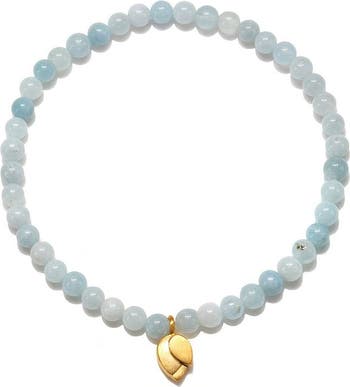 May your mind be at peace and your heart be open. A stretch bracelet of aquamarine stone of tranquility, courage and peace is accented by an 18kt gold plated lotus flower, symbol of new beginnings and full potential.Throughout the world, the lotus represents new beginnings, rebirth and infinite potential. In nature, the lotus roots itself in mud, arising daily from the murky water to burst into bloom. Aquamarine is the stone of courage, peace, and understanding, and the birthstone of March.