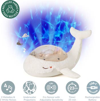 Tranquil Whale will transform your child’s room into a peaceful oasis. The light projector creates a serene underwater light effect with softly undulating waves. It also includes four calming sounds to help comfort the babies and young children at bedtime. The Tranquil Whale is a calming night light that projects ocean waves onto the ceiling and plays soothing sounds. Its soft glow and plush material make it a comforting companion for babies and young children at bedtime. The adjustable light and volume allow parents to customize the setting to suit their child. The auto shut-off timer helps create a consistent bedtime routine. An intelligent Cry Sensor device with adjustable sensitivity automatically activates at the baby's first cry. This makes a wonderful gift to promote better sleep and help tackle bedtime struggles.