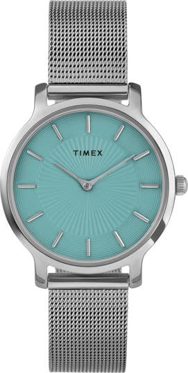 Subtly raised hour markers detail the richly textured dial of an analog-quartz watch set on a gleaming mesh strap made of durable stainless steel.