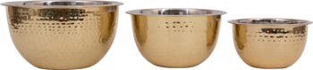 - This classically designed set of serving or mixing bowls features a hand-hammered texture and glistening gold finish