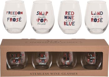 • Celebrate patriotism with the Transpac Glass 18oz Clear Patriotic Stemless Glasses Set of 4, perfect for gifting during national holidays and summer gatherings.