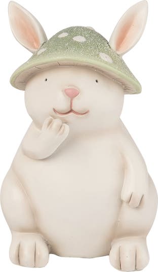 - Delightful 5.75" White Spring Mushroom Hat Bunny Figurine, perfect for springthemed gift giving and seasonal decor, crafted from durable resin for indoor tabletop display.