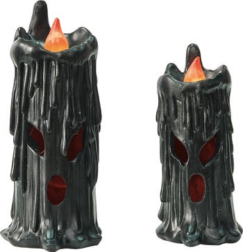 Transform your Halloween decor with the Transpac Resin 8.25 in. Black Halloween Creepy Candle Set of 2. These striking decorative accents are perfect for adding a touch of spooky elegance to your indoor spaces. Crafted from durable resin, each candle features a hauntingly beautiful design that captures the essence of the season. Battery operated with two LR44 batteries, these candles provide a flickering glow without the worry of flames, making them safe for any tabletop display. Ideal for Halloween parties, they also make thoughtful hostess gifts or unique additions to your seasonal decor. Easy to maintain, simply spot or wipe clean to keep them looking their best. Embrace the spirit of Halloween with this charming candle set that will delight guests and elevate your festive atmosphere.