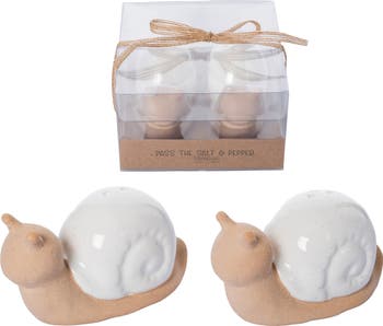 Add a whimsical touch to your dining experience with the Ceramic Snail Salt and Pepper Set of 2. This charming set, crafted from durable ceramic, features delightful snail designs that bring a playful element to your tabletop decor. Perfect for spring gatherings or everyday use, these collectible shakers not only serve a functional purpose but also double as eye-catching decor pieces. Measuring 4 inches in length and width, with a height of 2.5 inches, they fit seamlessly into any kitchen or dining setting. Whether you're using them for seasoning your favorite dishes or displaying them as part of your home decoration, this snail salt and pepper set makes a delightful gift for friends and family who appreciate unique collectibles.