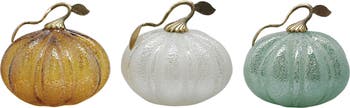- Set of 3 decorative glass pumpkins in amber, mint, and white colors, perfect for adding a touch of fall charm to your home.