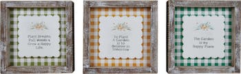 Enhance your spring decor with the charming MDF/Wood Framed Signs Garden Set of 3. These delightful decorative signs are crafted from durable wood, featuring a vibrant multicolored design that adds a cheerful touch to any garden or home setting. Each sign measures 6.5 inches in length and height, and 1.5 inches in width, making them perfect for displaying on shelves, walls, or in your garden. Ideal for gift giving or as a playful addition to your home decoration, this set brings a sense of whimsy and warmth to your space. Whether you're celebrating the season or simply looking to brighten your environment, these signs are a delightful choice for any springtime occasion.