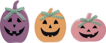 - Set of 3 decorative MDF epoxy jack-o-lanterns perfect for Halloween celebrations.