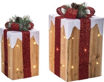 - Enhance your holiday decor with the Transpac Wood 12.5 in. Multicolor Christmas Light Up Snow Covered Gift Decor Set, featuring two beautifully crafted wooden gift figurines that illuminate your indoor space with festive charm.