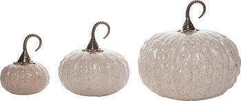 • Elevate your fall decor with the Transpac Glass 9 in. OffWhite Harvest Vanilla Bean Pumpkin Set of 3, perfect for gift giving and seasonal home styling.