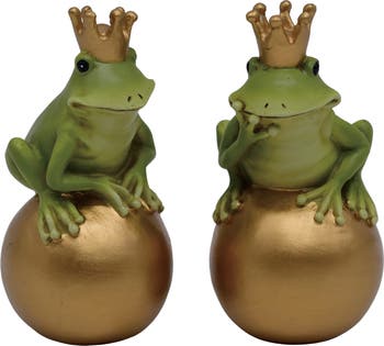 Add a whimsical touch to your garden or home decor with the Resin King Frogs on Sphere Set of 2. This charming set features two delightful frogs perched atop elegant spheres, crafted from durable resin in a vibrant green and gold color scheme. Standing at 4.25 inches high and measuring 2.25 inches in both length and width, these figurines are perfect for adding a playful element to your springtime decorations. Ideal for gift giving or as a unique accent piece, these frogs will surely bring joy and character to any space. Whether displayed in your garden, on a shelf, or as part of a centerpiece, the Resin King Frogs on Sphere Set is a delightful way to celebrate the season and enhance your home's charm.