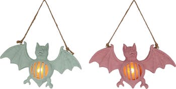 - Set of 2 vibrant green resin LED bats perfect for Halloween wall decor.