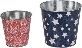 - Enhance your patriotic decor with the Transpac Metal Americana Containers Set of 2, featuring durable metal construction and a charming design perfect for indoor tabletops.