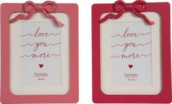 Enhance your home decor with the charming Wood and Resin Bow Frame Set of 2, perfect for showcasing your favorite memories. These delightful frames feature a unique multicolored design that adds a playful touch to any space, making them an ideal choice for Valentine's decor or gift giving. Crafted from durable resin, each frame is designed to hold photos securely while adding a decorative flair to your walls or tabletops. Measuring 7 inches in length, 1.1 inches in width, and 9.41 inches in height, they are perfectly sized to fit a variety of photo styles. Whether you're displaying cherished moments or giving them as a thoughtful gift, this frame set is a wonderful addition to your home.