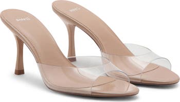 A see-through strap keeps the look minimal in this mid-height slide sandal set on a slender stiletto heel.