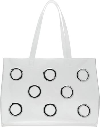 Oversized metal grommets highlight the translucent exterior of a bold and spacious tote suspended from a pair of slender shoulder straps.