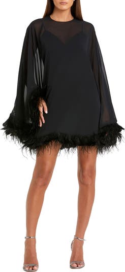 This trapeze mini dress with feather trim blends glamor and playfulness, offering a flattering fit and elegant touch. Perfect for date night or special occasions, it’s a statement piece.