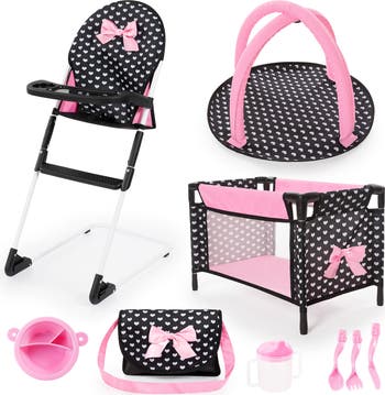 - Versatile 9-Piece Set: Includes highchair, bed, playground, and more, ideal for dolls up to 18 inches, ensuring stylish play with black and pink hearts design.