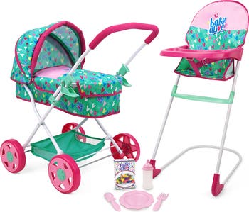 BABY ALIVE: PRAM N' FEED SET - 7PCS - GREEN, PINK, HEARTS - The Baby Alive 7 Piece Travel and Feed Play Set is a wonderful role-play ensemble featuring a doll pram, highchair, and various accessories. Designed for little parents to engage with their favorite dolls and plush characters, this complete care set seamlessly blends fantasy with real parent role-play. The half-folding pram boasts a charming Baby Alive pattern, a bassinet, and two-toned wheels, making it easy to store or travel with. The set also includes a doll highchair complete with a front feeding tray and five-piece doll feeding accessories. This all-in-one care set promises endless fun and imaginative play for young caregivers worldwide! INCLUDES: Doll Pram, Highchair, Feeding Accessories. PRODUCT DIMENSIONS: Pram: 23 (L) x 15 (W) x 22.4 (H) inches. Highchair: 11.2 (L) : 15.1 (W) x 26.3 (H) inches. Suitable for dolls up to 18 inches (46 cm). **Doll Not Included** Suitable for girls & boys ages 3 and up.