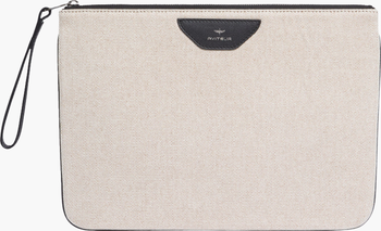 Travel Pouch Maxi is a stylish and functional pouch made from durable canvas with leather trim, perfect for carrying laptops and documents. It features an inside pocket and a zip closure in anodised rose gold.
